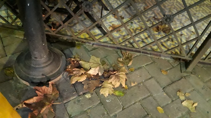 Me chama a atenção um monte de folhas secas caídas no chão, quase ao pé do poste. Secas, bege, tom pastel comum em representações de outono. Essas representações de outono herdadas de filmes e livros estrangeiros. Não me lembro de outono bege no Brasil. Os daqui, pelo contrário, são claros, iluminados, cheios de cores primárias. No máximo, se molham de chuva criadeira que logo passa.